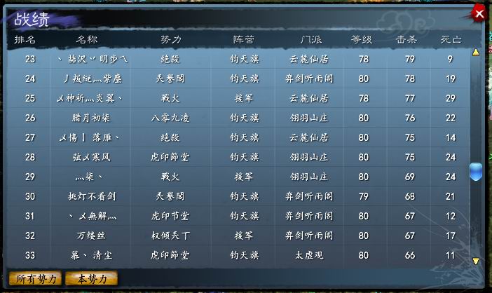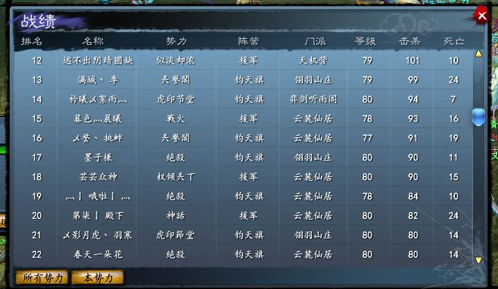 11月20日城战。守方:权倾兲丅、神話、似淡却浓、盛世唐朝、戰火、魔教锐金旗、無上。攻方:絶殺、兲譽閣、八零九凌、虎印节堂、虎印節堂。城主:虎印節堂
