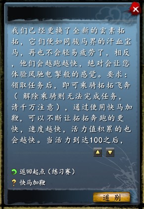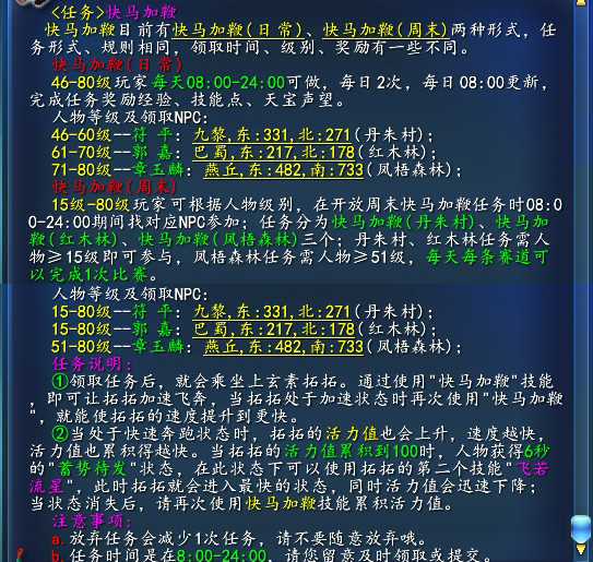 快马加鞭(日常):根据不同等级,到相应地方领取任务。领取该任务最低等级为46级
