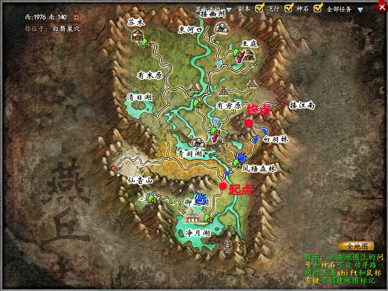 横跨白羽林,凤梧森林。在跑拓拓过程中,有四个地方可以“抄近路”。上图中:标记为蓝色,可以抄近路到达终点。