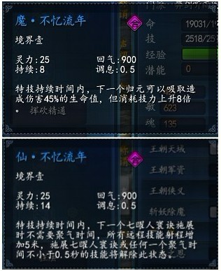 在实战中,仙系特技相对于魔系特技来说,对自己的负面影响要小得多。需要注意的就是二代九天武器特技超长的回气时间(13钻是900秒回气),而魔系特技使用前还需要注意自身的技力值是否充足,千万不要在中了失心后还要强硬使用,其下场…你们懂得。