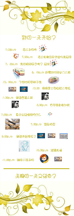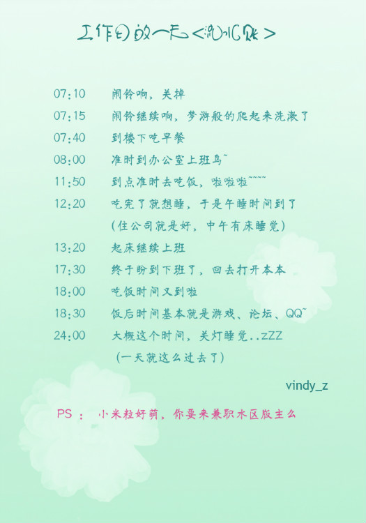 活动要求:大家可以晒下平时一天的生活,以时间的顺序排列。例如09:30 xx地点XX事件,模板可以见米粒上面发的图片喔。