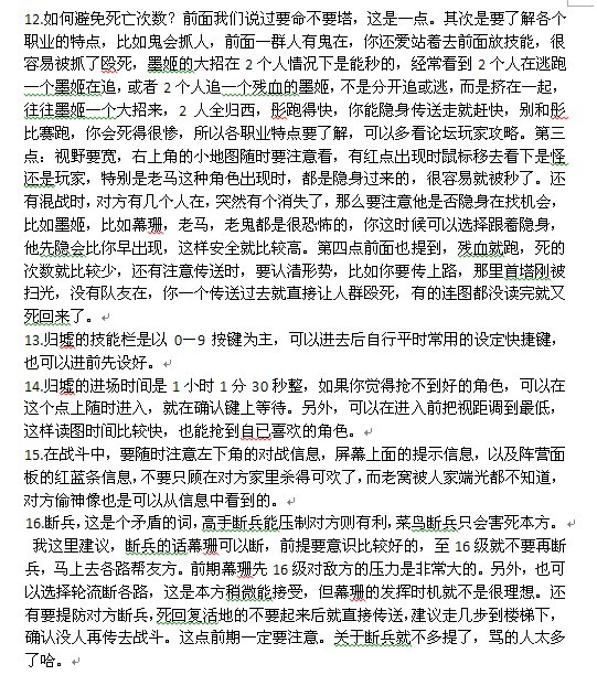 12.如何避免死亡次数?前面我们说过要命不要塔,这是一点。其次是要了解各个职业的特点,比如鬼会抓人,前面一群人有鬼在,你还爱站着去前面放技能,很容易被抓了殴死,墨姬的大招在2个人情况下是能秒的,经常看到2个人在逃跑一个墨姬在追,或者2个人追一个残血的墨姬,不是分开追或逃,而是挤在一起,往往墨姬一个大招来,2人全归西,彤跑得快,你能隐身传送走就赶快,别和彤比赛跑,你会死得很惨,所以各职业特点要了解,可以多看论坛玩家攻略。第三点:视野要宽,右上角的小地图随时要注意看,有红点出现时鼠标移去看下是怪还是玩家,特别是老马这种角色出现时,都是隐身过来的,很容易就被秒了。还有混战时,对方有几个人在,突然有个消失了,那么要注意他是否隐身在找机会,比如墨姬,比如幕珊,老马,老鬼都是很恐怖的,你这时候可以选择跟着隐身,他先隐会比你早出现,这样安全就比较高。第四点前面也提到,残血就跑,死的次数就比较少,还有注意传送时,要认清形势,比如你要传上路,那里首塔刚被扫光,没有队友在,你一个传送过去就直接让人群殴死,有的连图都没读完就又死回来了。