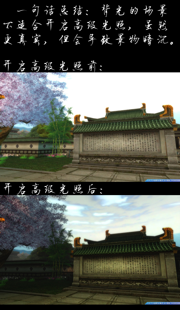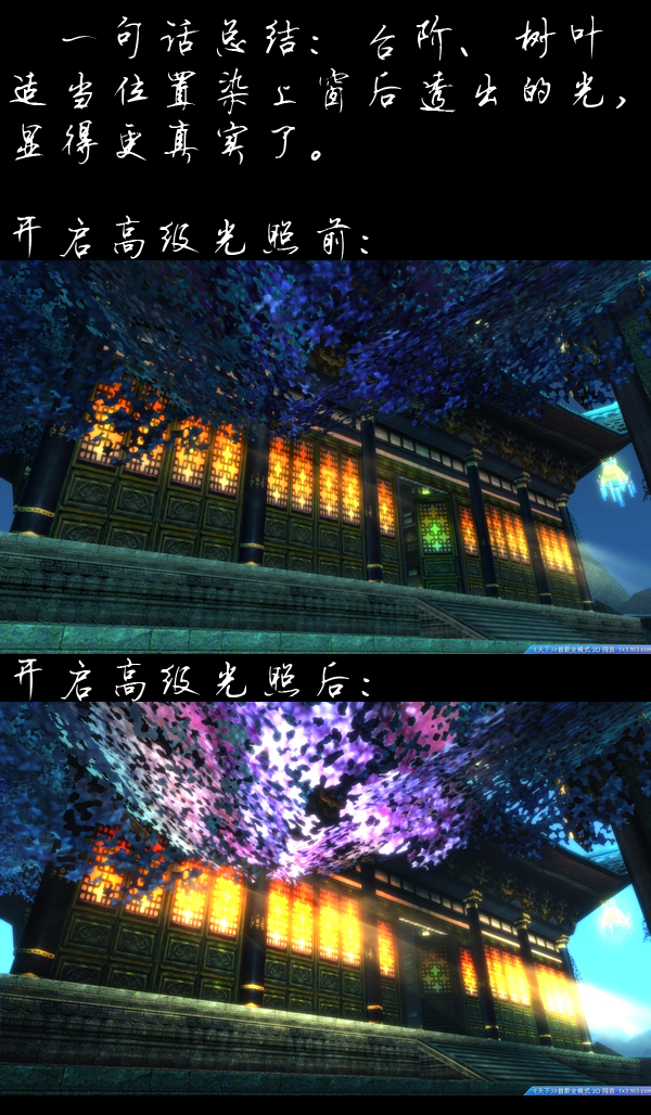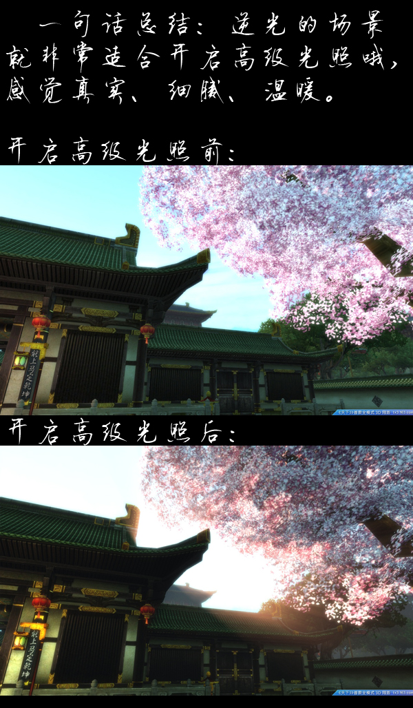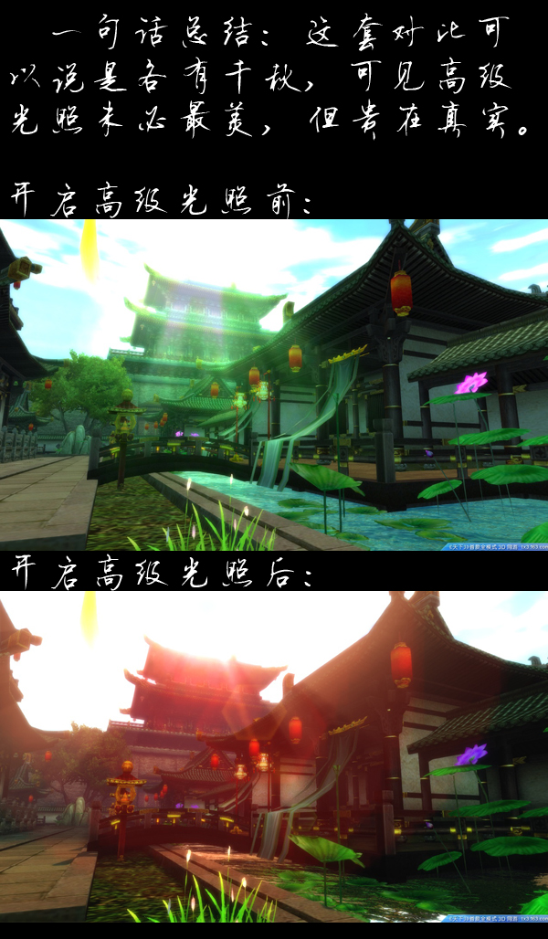 高级光照我觉得确实不是所有场景、所有时间都适合,但是无可否认,开启后是真实很多的,立体感也好很多~