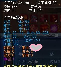 ======================= 首先是紫陌玄套孩子,是特地跟弄了的亲要的图,装备基本均9钻,防御技能8级左右.这里需要指明貌似重击计算跟人物不同,孩子的是所有类别重击加在一起算起来的,实际毒重可能大概在80点的样子?当时没有细问有用紫陌玄的亲可以给我指正一下.