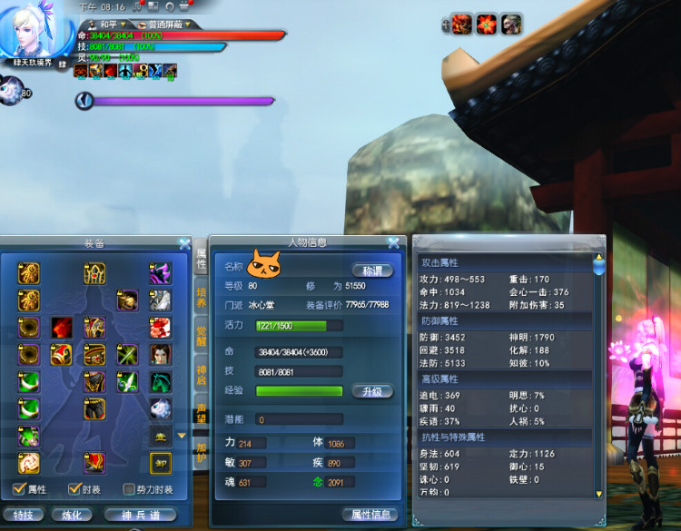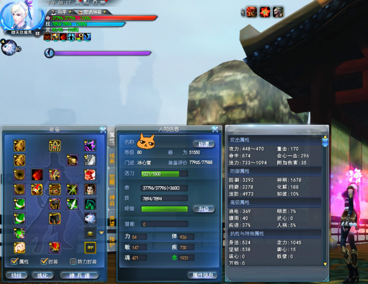 忘了说~装备是4件80世界,4件80战场~武器是70战场武器。正在刷一念三千~