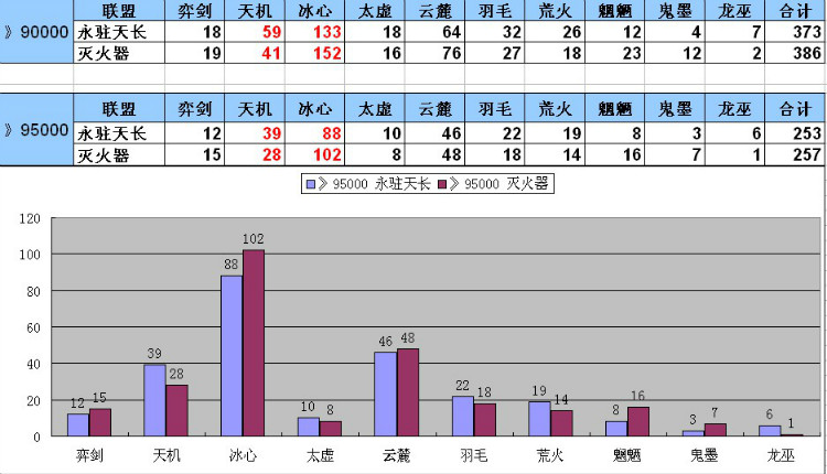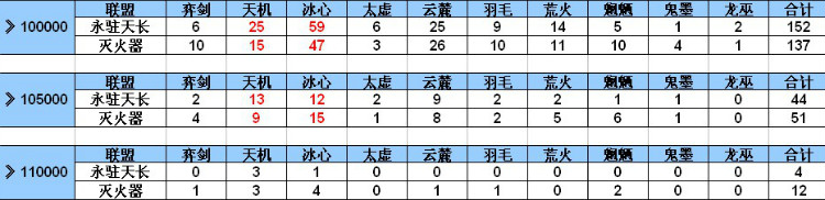 冰心概况:中端冰心,灭火器数量上占优势,但在10万-10.5万的高端号,永驻占优势,相对来说10.5万以上灭火器又稍弥补点。