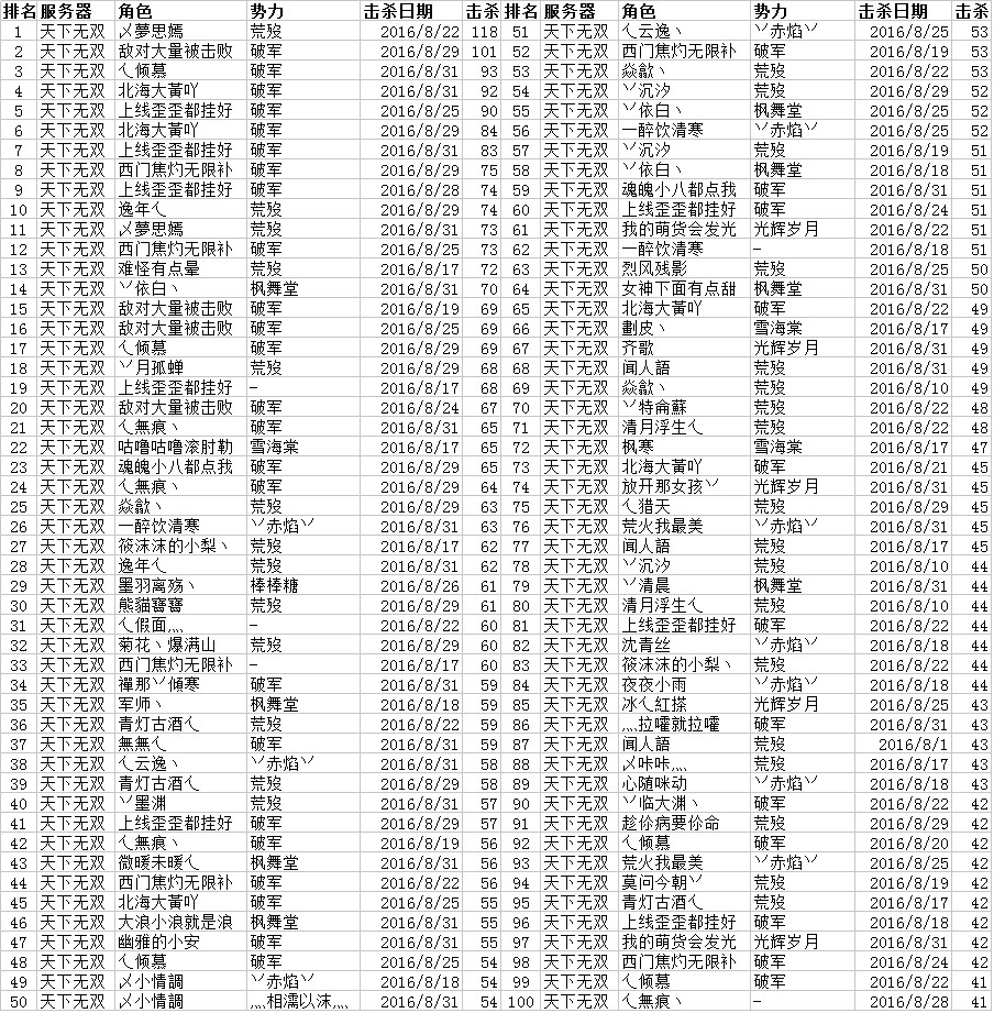 2016年8月无双战报合集