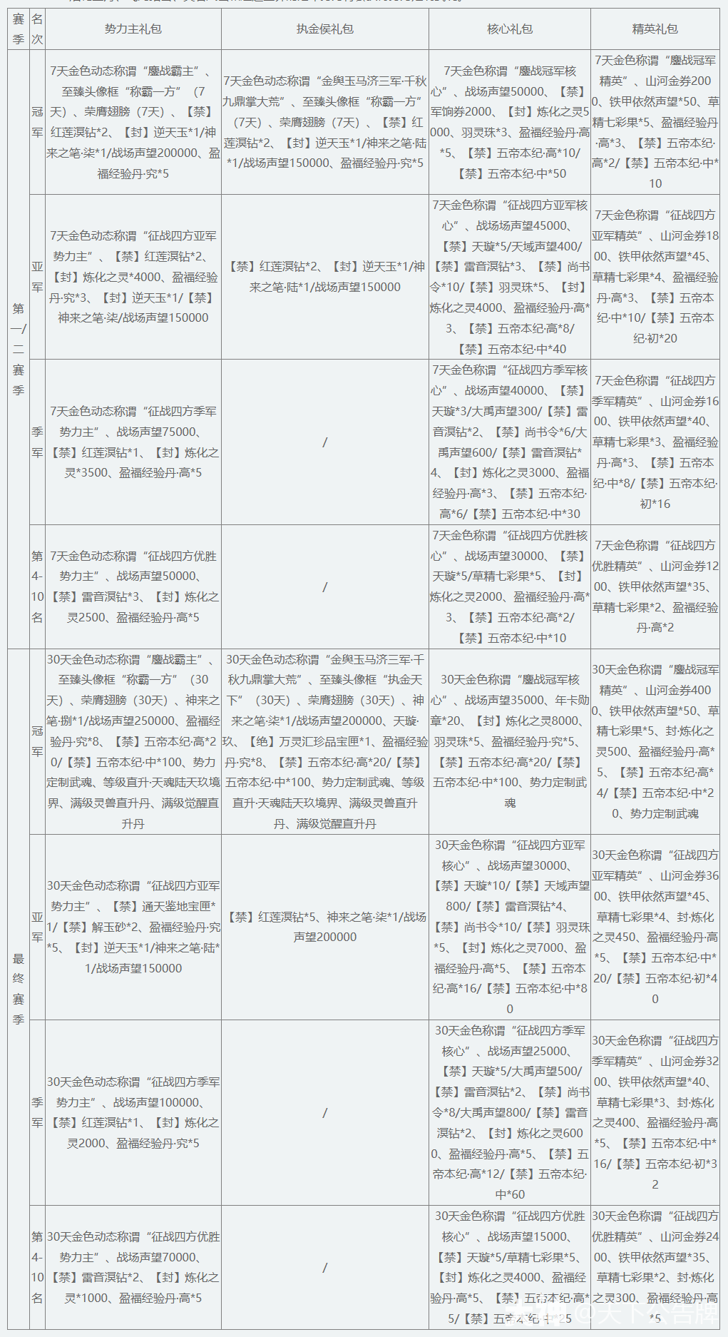 3.季军势力奖励:征战四方季军势力主礼包*1、征战四方季军核心礼包*10、征战四方季军精英礼包*100