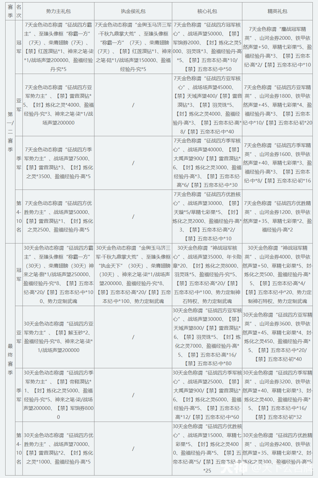 1.冠军势力奖励:征战四方霸主礼包*1、执金侯礼包*1、征战四方冠军核心礼包*10、征战四方冠军精英礼包*150