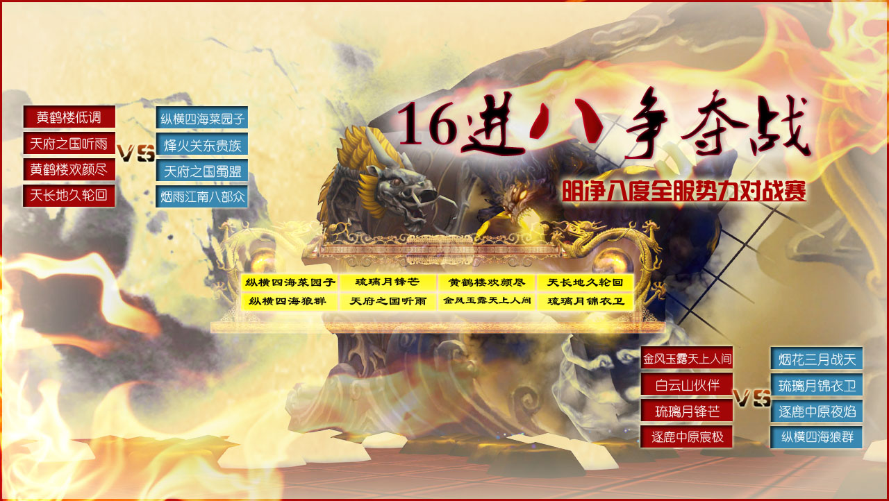 今天晋级8强的是:琉璃月锦衣卫 琉璃月锋芒 纵横四海狼群 金风玉露天上人间