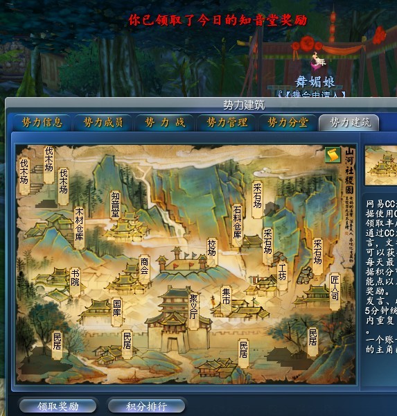 然后在第二天可以领到前一天的知音堂奖励。也就是势力贡献+经验技能点什么的啦~