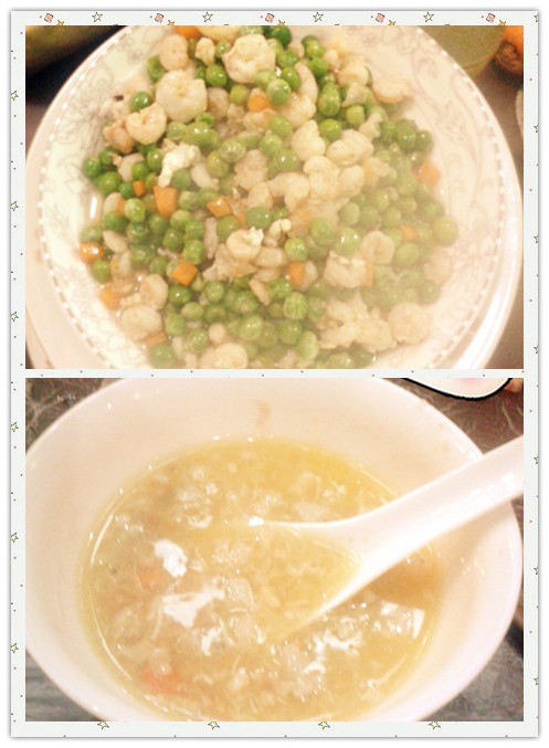 青豆炒虾肉、蟹黄羹、炸鸡翅、甜饭