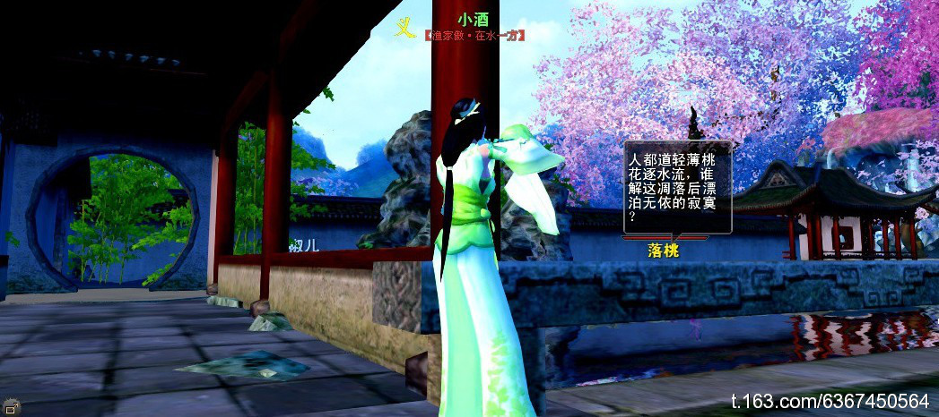 标题: 月亮门,绿衣少女,桃花,红色的廊柱,齐活!