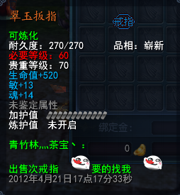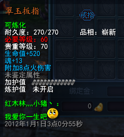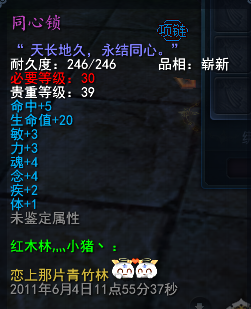 11年的时候留下的同心锁,那时候炼化石最高等级75级吧,楼主还合了一个80的迅法石给她炼化,她不舍得用让我卖掉,然后我为了炫耀挂在寄售上,结果没挂价钱被人买走了,囧~~