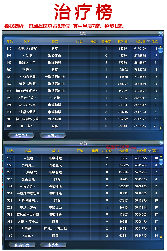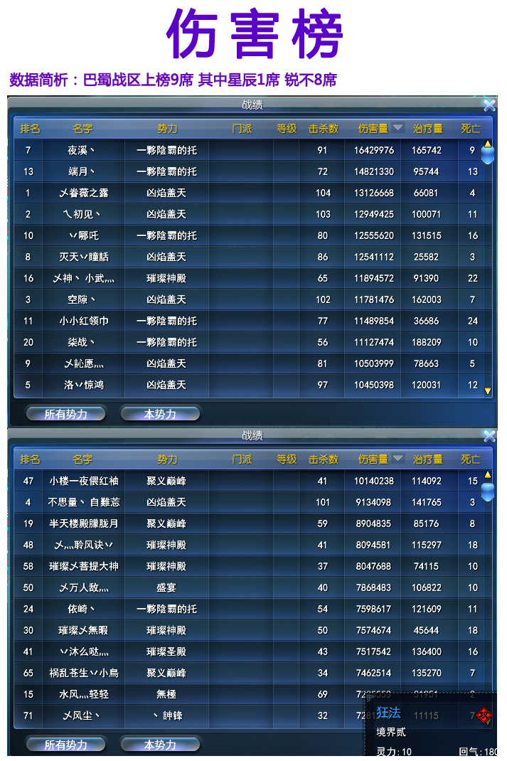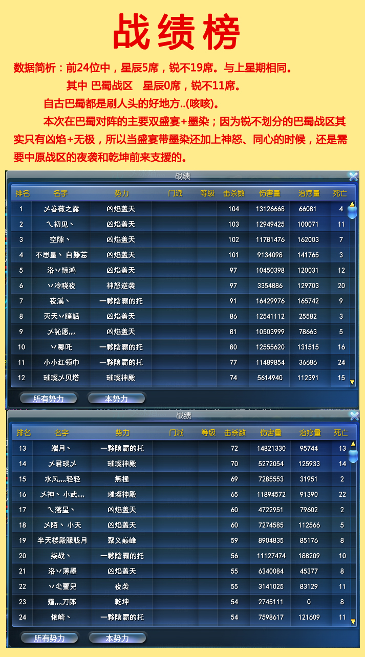 简单总结:星辰方虽然榜面数据不佳,YY人数也较上星期减少了一些。但是实际势力战过程中在人员调动以及巴蜀战区和中原战区互相配合等等方面还是比较出彩的。经常能看到这边八卦田里还在对推中,但是那边已经有人员前往丹萍寨洗台子,八卦田里死亡的人员也不多做挣扎,直接复活到丹萍寨神石直奔台子里。等到我方人员调度到台子门口的时候,往往台子里已经洗了有将近3分钟左右。这个时间差掐的相当高明。在最后时刻调动各个势力分别去相应的台子进行骚扰,牵制住各家的势力,也为盛宴最后洗下丹萍寨台子创造了很好的大环境。