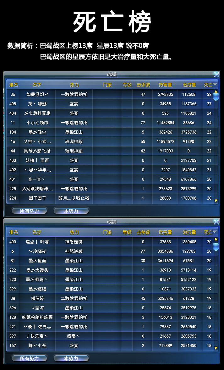 本战区死亡榜也和治疗与输出榜面关联上了。治疗多的,死亡依旧很多。