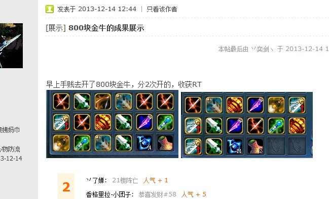 [截图没有,我不是真·壕,没想过4把武器就直接充8000元宝开,屌丝一组两组充的,加上收牛和内心挣扎,历时一下午。系统出信息的频率在此不用多说,穿插其他信息,就算系统一个一个翻着找到截出来拼一起,也保不准遇到你这样的说我是P的]