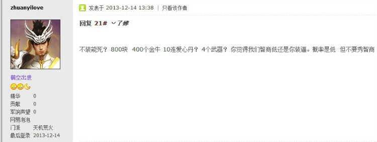 我连不连着开这伙计也要管,你有钱为了400武器虫8000元宝,我一个国内普通本科的苦逼学生还真没那个豪气,我就是抱着侥幸心理充一组是一组,壕,让你见笑了