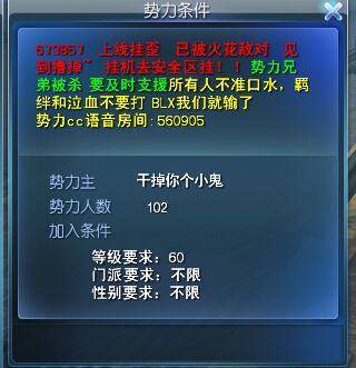 我就问你,敌对了互相杀不行了么?既然知道了自己69势力有敌对势力也是69之间的为啥不退势力?你说被杀了一次不甘心,好啊,那你们79的参加两三次对推还不行?不是一直跟着你们打么?还有,你们后来加的79天机呢,前两天加的神启YL呢,刚敌对的时候在你们势力么?| 欢迎光临 《天下3》官方论坛 (https://tx3.netease.com/) | Powered by Discuz! X3.3 |