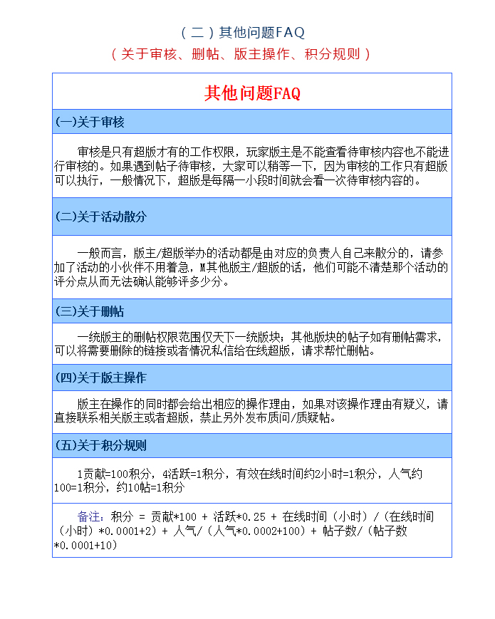 (二)其他问题FAQ(关于审核、散分、删帖、版主操作、积分规则的问题)(待补充)
