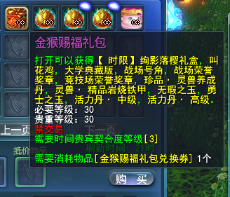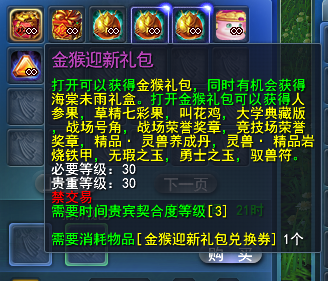 2、金猴迎新礼包打开可以获得人参果,草精七彩果等多种珍稀道具,同时有机会获得海棠未雨礼盒;金猴赐福礼包打开可以获得【时限】绚影落樱礼盒等多种珍稀道具。