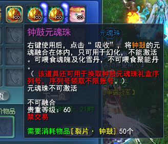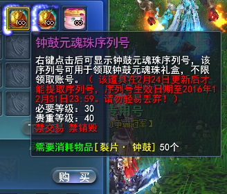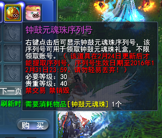 4、钟鼓元魂珠序列号可通过钟鼓元魂珠碎片或钟鼓元魂珠换取,序列号道具将于2月24日更新后生效,右键点击道具可生成序列号,兑换截止日期为2016年12月31日24点。