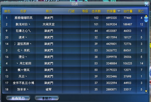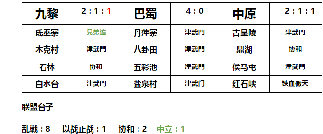 本周势力战以战止战联盟全程无抱团,各家势力各自为战。乱战联盟以8个台子优势位登榜首。