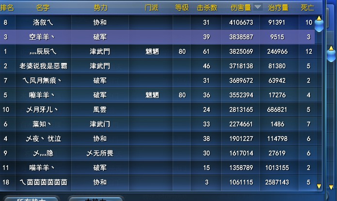 战后总结: 风云单走,无所畏跟铁血傲天一条线,乱战方破军单走,双色津武门一条线!乱战两条线都碾压铁血,铁血占据死亡榜前几页,上周风云用伤害榜自卫,这周我推荐你们用治疗榜自卫!计几调,以后俊俊问你无所畏+铁血傲天打不打得过破军的时候,想好再说,我真的觉得很搞笑。。视频放1L。看看无所畏的战斗力。。。