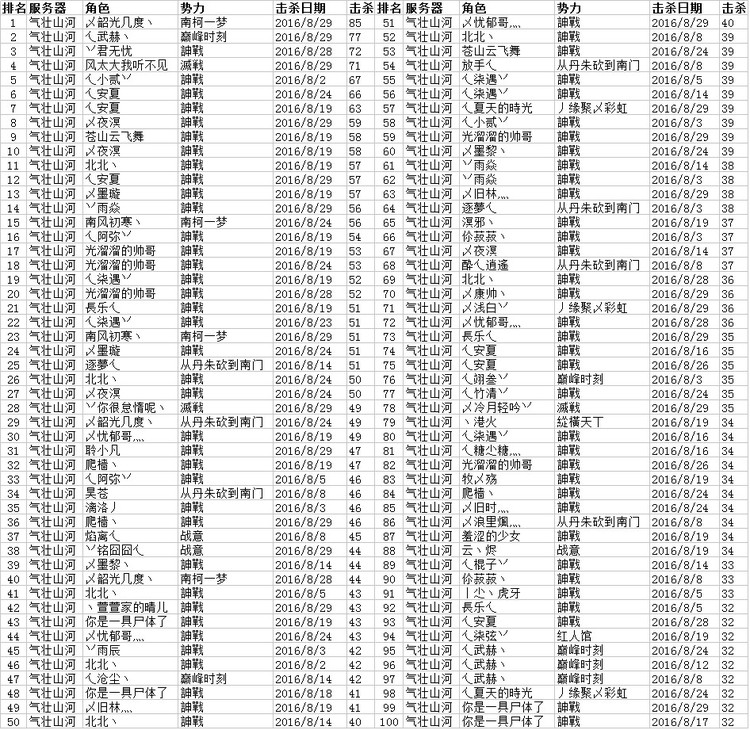 乄逸云灬 发表于 2016-9-6 20:57 【流光梦境击杀】产生击杀最多10天 散点图 击杀数势力排行