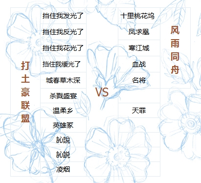 风雨同舟这边 凤求凰 十里桃花 ,天罪(凤求凰分出来的) 名将,血战,这些算是满编势力8家加上神陪我流浪,明州府,聚义厅,择日当归(快被吸干)藏明阁(快被吸干)这些还有运营能力的.