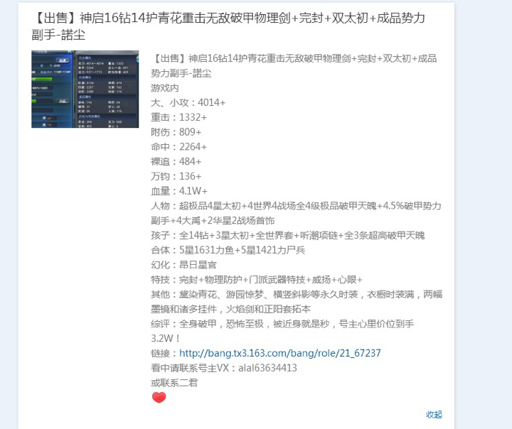 预售期完毕,现在正式上架,已经找二君估过价,属性堪称粉中上乘,专门针对受职业,伤害可观,屠龙请绕道,希望可以遇见有缘人,无论是谁都恳请你善待此号,因为现实原因,没法继续玩了,有黛染青花、游园惊梦、横竖斜影等永久时装,衣橱时装满,两幅墨镜和诸多挂件,火焰剑和正阳套拓本,下面附一些外观和衣橱的截图以及游戏打完神祝的属性面板,游戏内裸小攻准确数值为3710,请看英雄榜珠子加联系方式,可小刀,不贱卖![attach]6153438[/attach][attach]6153435[/attach][attach]6153436[/attach][attach]6153437[/attach][attach]6153439[/attach][attach]6153440[/attach][attach]6153441[/attach][attach]6153443[/attach][attach]6153442[/attach][attach]6153444[/attach]