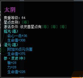 我用了双子伤模具,在我区约(510J)30元每个,其它的诸如白羊伤和巨蟹攻,都是很适合YJ的,不过更贵,我们区约50元每个。 接着买了65至68的太阴若干,平均一个算下来470J左右,算上七曜锥也就是弄一手花费90元上下(1500j),我的马74级共5个星点,总共弄了9次,最后全部激活后的属性如下图