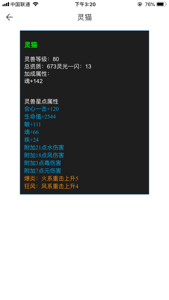 我发现不管70还是72还是73贵重,出的属性数值都差不太多,这让我不是很爽,于是我又翻榜看了一位用同样方法灵化的朋友的星点属性,如下图