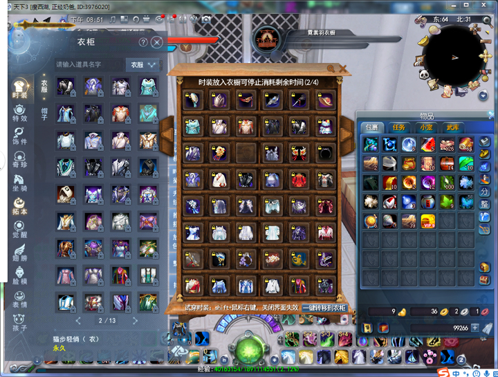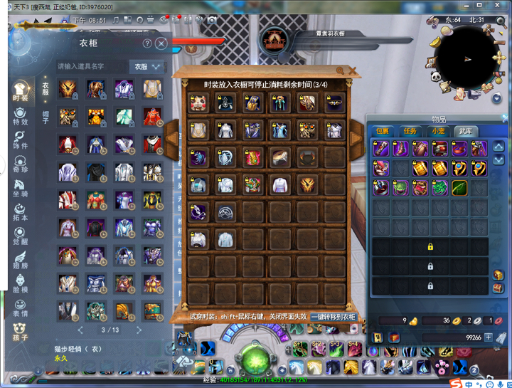 衣服:13永久,3XZX,仓库珠子46,称谓券171