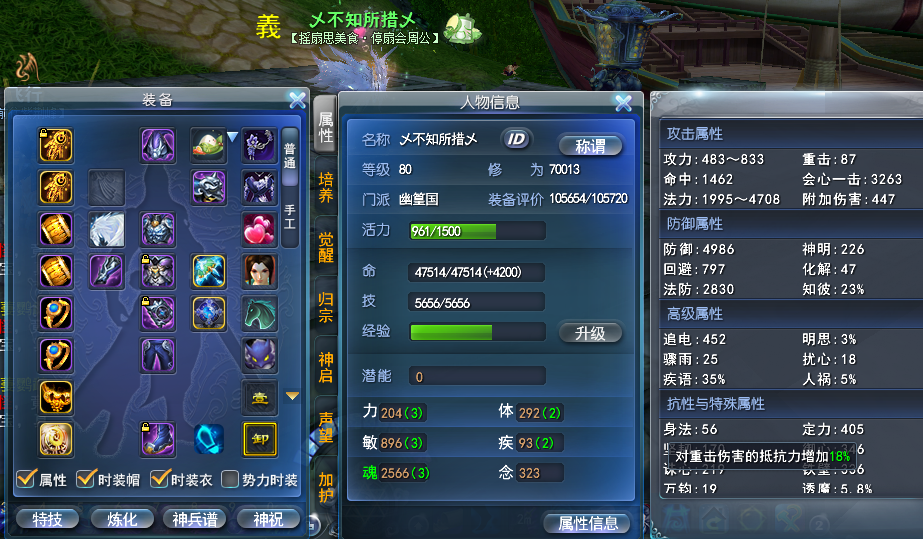 人物:极品4星太初+4%透魔势力副手+全战场套(全3级知彼/大法天魄)+4大禹4战场首饰 单大禹戒指
