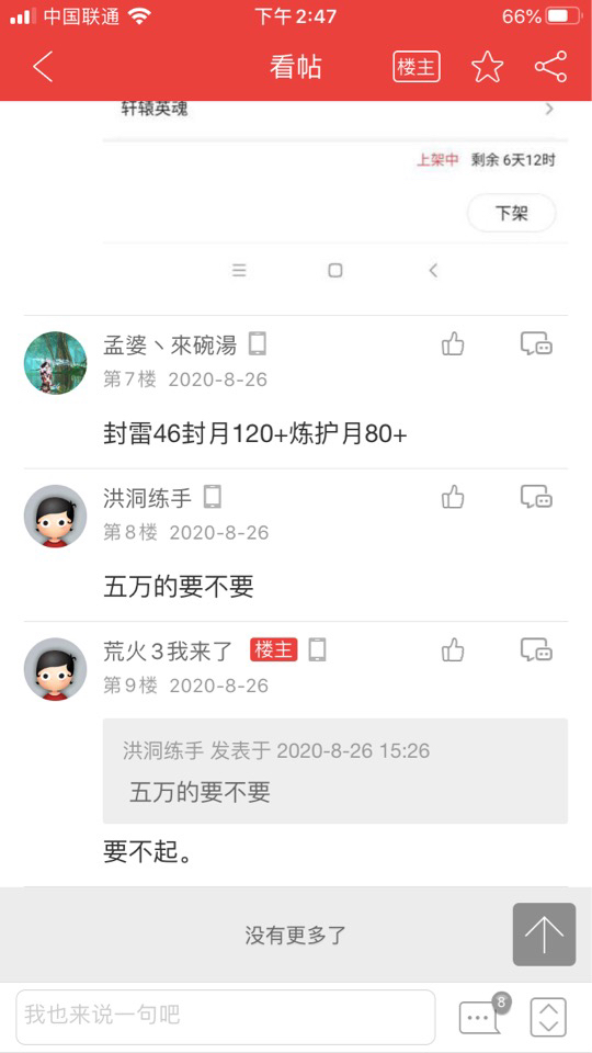 我那个74小破号也只卖了5万。赶你的魍魉差太远了。你的还没卖出去?卖了存钱买yj