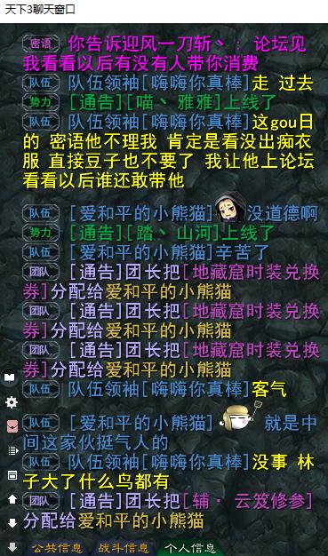 事情是这样的,我带77消费,这个HH进团说需求痴衣服和豆子,然后我们就愉快的开团了,然而打完老三后,令人心动的时刻到来了,这个HH看没出痴衣服,什么话都没说直接退团退队,我密语他也不理人,下面是截图,大家小心,注意避雷,肯定是个惯犯。而且我怀疑他根本不想消费豆子,只是怕只要1件装备没人带,他的身上一件装备都没有培养。