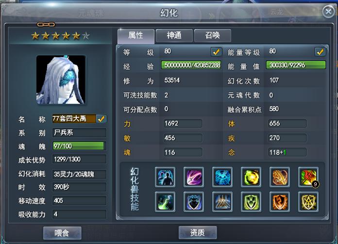 77套培养满,4大禹,九天武器,带2合体珠子,仓库武库全开,座机有升龙变,永久龙图时装,没时间搞了便宜出