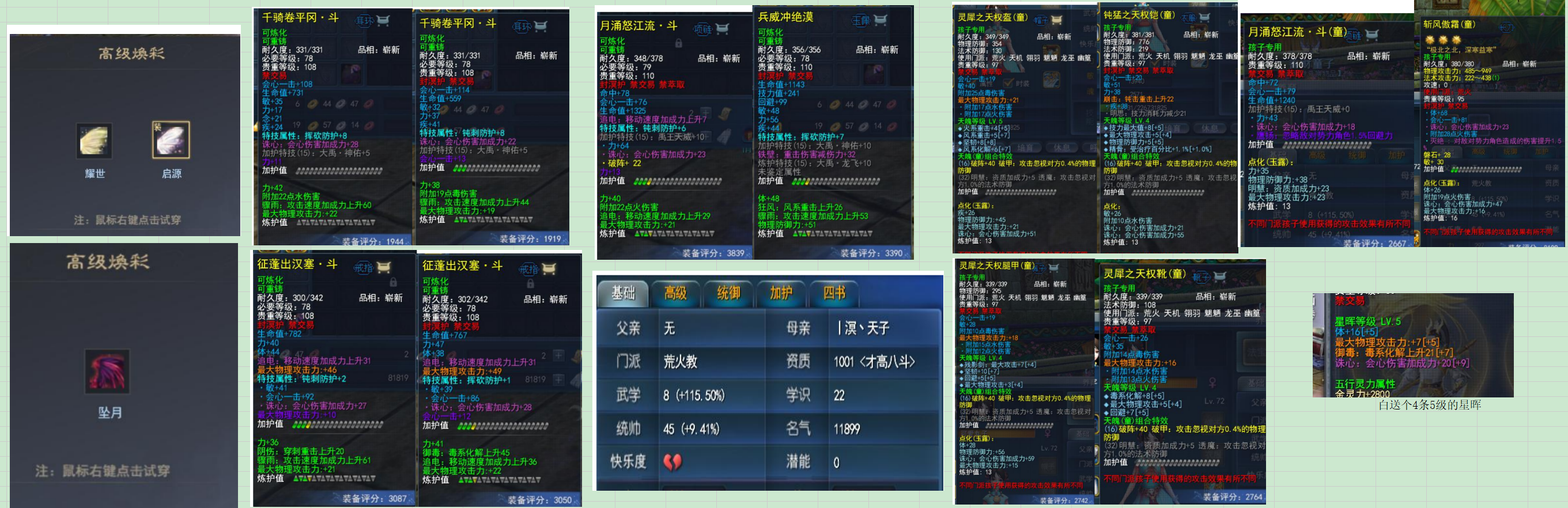 2代3代翅膀全染色共5个,一套会心大禹首饰,戒指极品激活敏+会心+诛心,荒火孩子武学8裸资质1001