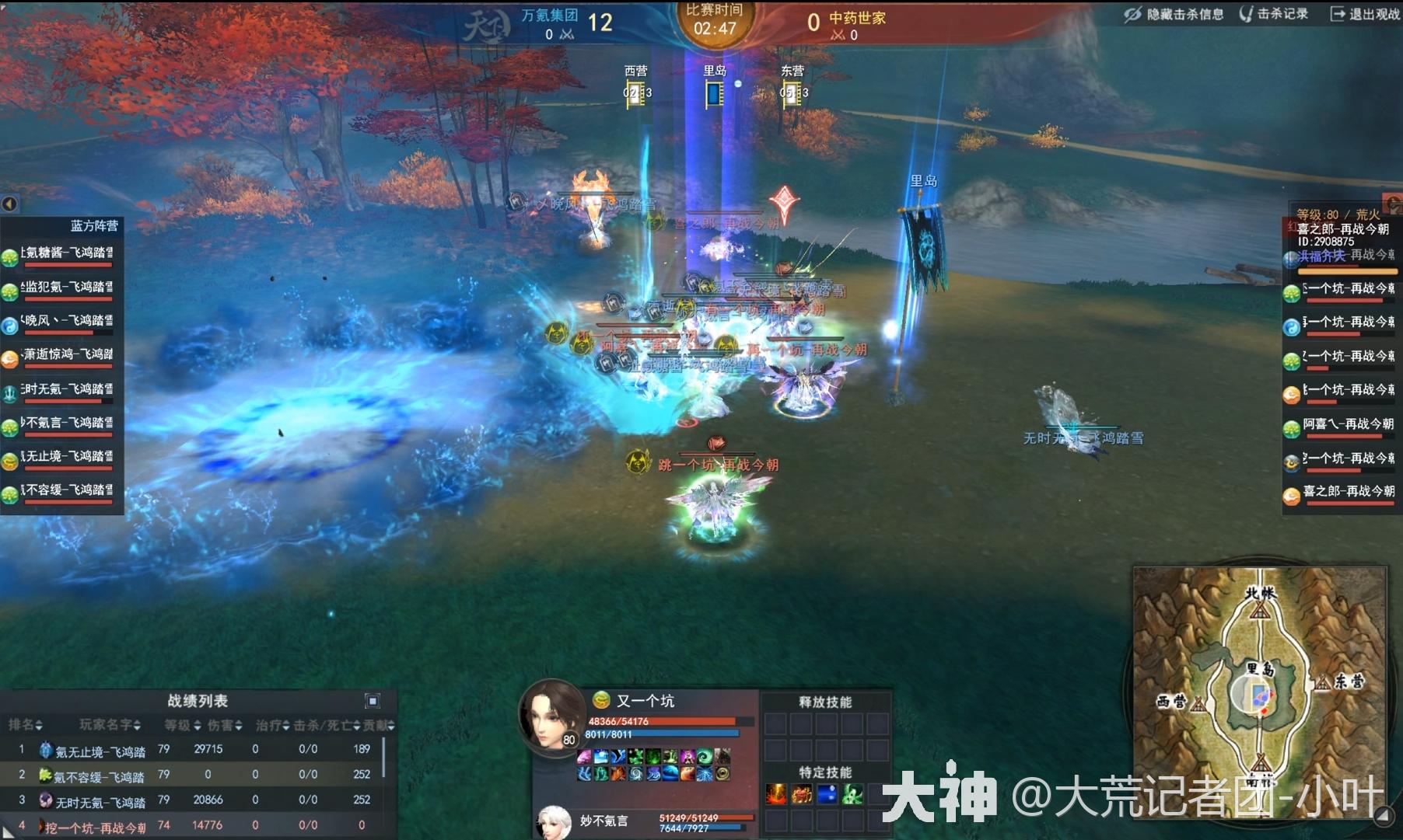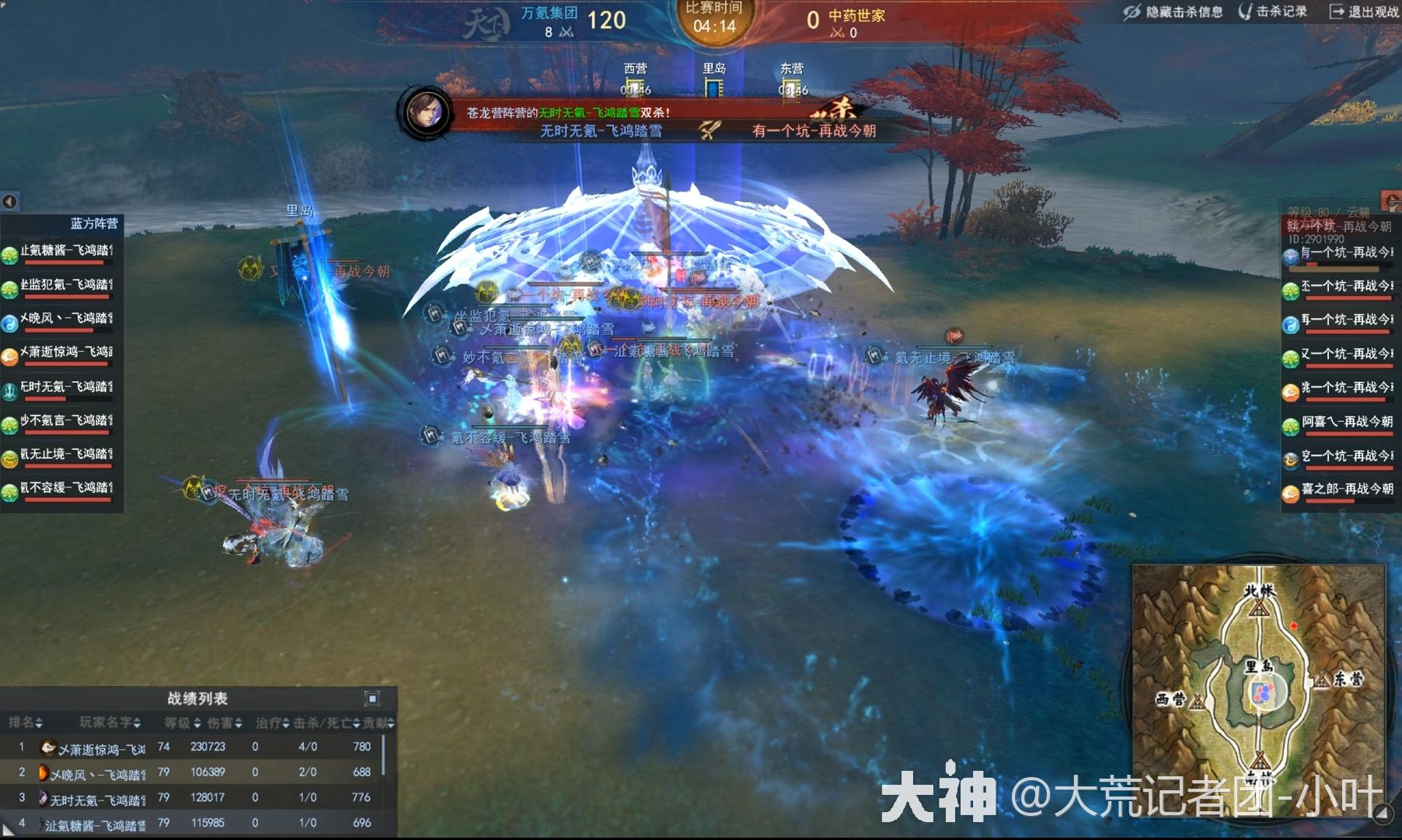 蓝色方虽然积极补位,但在蓝色方陆续减员下,红色方顺势将西营得分收入囊中,随后红色方再次来到里岛等待资源刷新,蓝色方则在桥头集合等待队友复活到来。集合完毕后,蓝色方天机开启腾龙守,双云麓开启状态,红色方同样开启状态排列成一线备战。此时蓝色方云麓冲到旗下,天机和魍魉紧随其后,红色方幽篁则冲入蓝色方后排起控,同时其他成员跟上集火,将蓝色方荒火率先秒掉。蓝色方成员被红色方一分为二相隔开来,遂后排人员被红色方陆续集火掉。而旗下前排的蓝色方法系职业在红色方魂剑的克制下无法发挥,被红色方回头陆续击杀,蓝色方目前仍无法获取主动权。