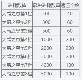 开启分别可得:【禁】大禹之恩(50)*5/【禁】大禹之恩(50)*10/【禁】大禹之恩(50)*20。每人每个礼包限购1个,购买前置礼包才可购买后续礼包。