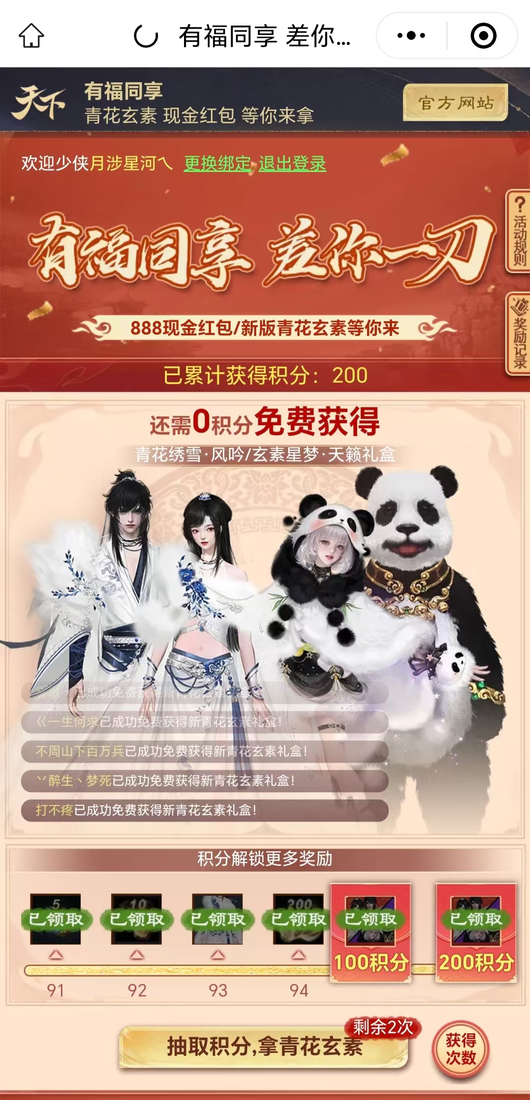 200积分获取截图,有永久的新青花和玄素,为了上架现在已经穿身上了