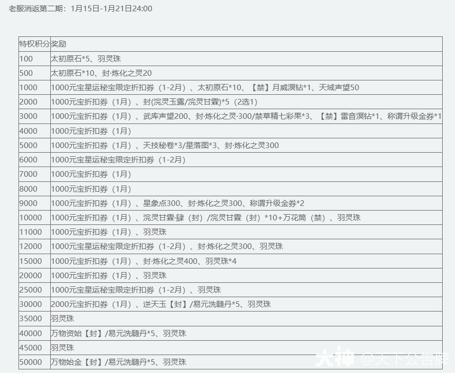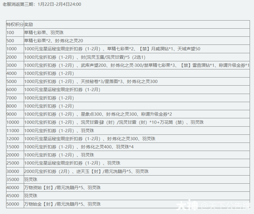 1月8日更新维护后至2月12日更新前在商城、积分特权界面消费(赠送代付行为不包含在内),均会获得订单金额1:1的消费积分。单服消费积分累积最高的50名玩家将会进入当期消费积分排行榜。