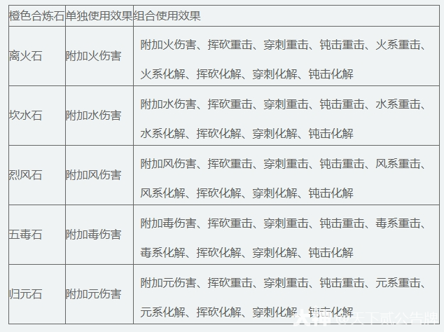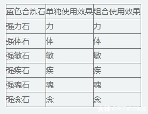 合炼时,如果只放入1种合炼石,则必定获得单独使用效果所示的属性。如果放入的合炼石不止1种,则每种合炼石会随机获得组合使用效果中的其中一种属性。而随着合炼次数的增加,也会越容易出现较高的属性数值。具体效果如下: