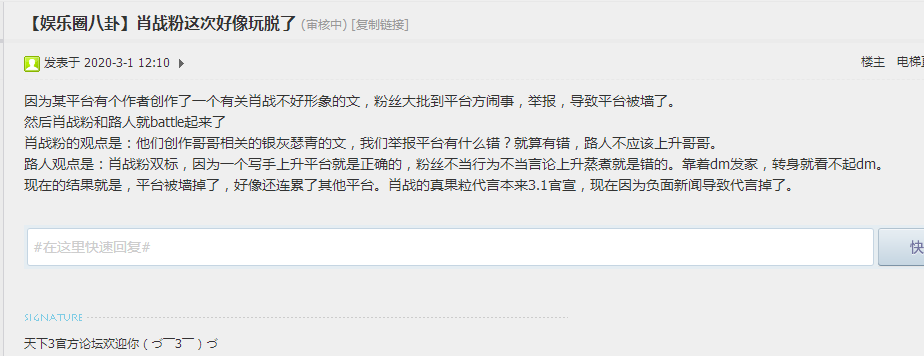 丷灵瑶灬 发表于 2020-3-11 17:35 吴宣仪家和肖战家早就撕起来了,那时候肖战还没火呢,被吴宣仪家压着喷不敢回嘴,后来肖战火了,拿这事嘲了吴宣仪家很久,现在又又两级反转了 只能说这两家真的是不死不休吧。至于杨紫。。。现在疼迅新闻那边出了好多通稿说小兔赞比是杨紫家反串陷害肖战。。。。。具体搜一下#杨紫肖战#就有具体帖子 |