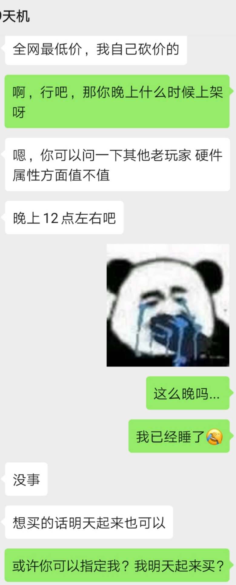 我朋友买号 跟老板谈了大半个月 天天磨他 老板终于同意刀了 朋友开心得不行 结果交易的时候 老板cbg直接改了交易价 没指定他 说你要买就买 就是这个价 对我没什么影响 朋友气炸了 说合着这段时间全帮别人砍价了 |