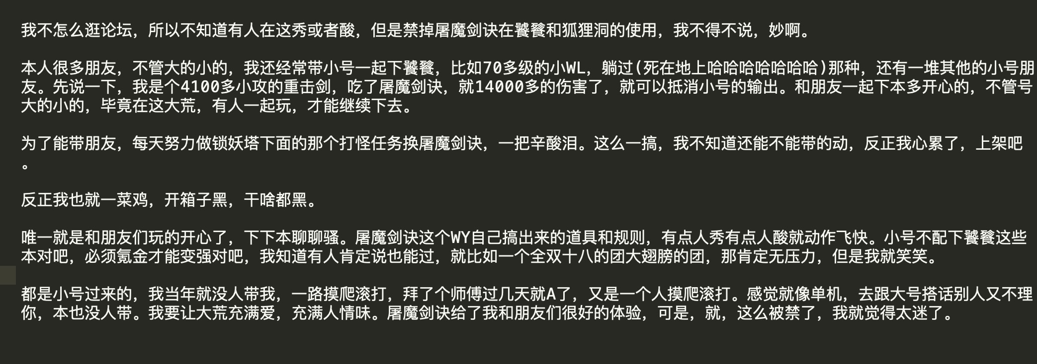我不是YJ,但是真的恶心有些人见不到别人好 固定团YJ也说了,以后省了刷剑诀了,其实他自己倒无所谓 之前就在一桶见过有人说屠魔要开给所有门派,实则是想要喷掉这个buff 我就不懂了,你的队友YJ开剑诀是帮着怪打你了还是怎么着了? 这个老年游戏又不存在别的游戏那种副本竞争上岗 你的队友帮你多输出你反过来要削弱他?损人不利己也太恶心了吧。。。 |