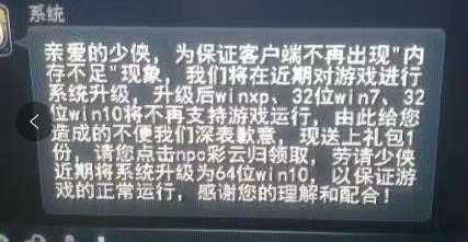 慕轻纱 发表于 2020-12-15 11:51 因为客户端是32位的,升级之后32位的电脑不能玩了 所以给32的用户补偿,这个没毛病。 至于内存不足的问题,那是所有的电脑都会出现(因为客户端的服务器是32位,和玩家电脑没关系)  |