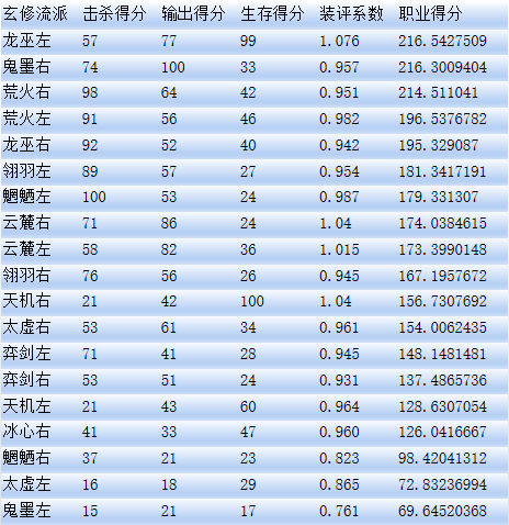这个测试数据同体验相差太大,体验着79几个号,毛毛(小工,左右玄修经常撤换,完封),wl(左玄,护心完封), 重击hh(左,护心完封), 云麓(右玄,完封),力敏剑(左,完封),wl击杀100分,天机生存100分这个分数太虚了,hh的生存也是评分低的厉害,79锤爆头参考一下 |