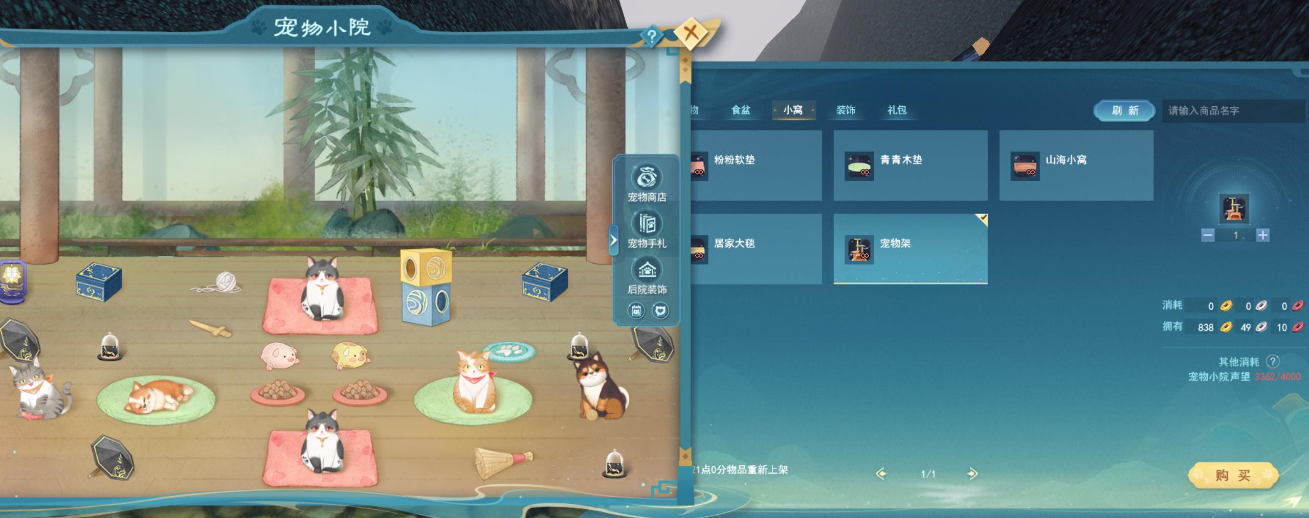 每天上线第一件也是最开心的事就是去摸摸小猫小狗,目前在攒声望买这个猫爬架,一个架子能多三个宠物格子,也是很期待摆放出来长什么样了。 小tip:喂40声望的狗粮猫粮个人觉得可以增加有空位时野猫野狗来家里和家 ...